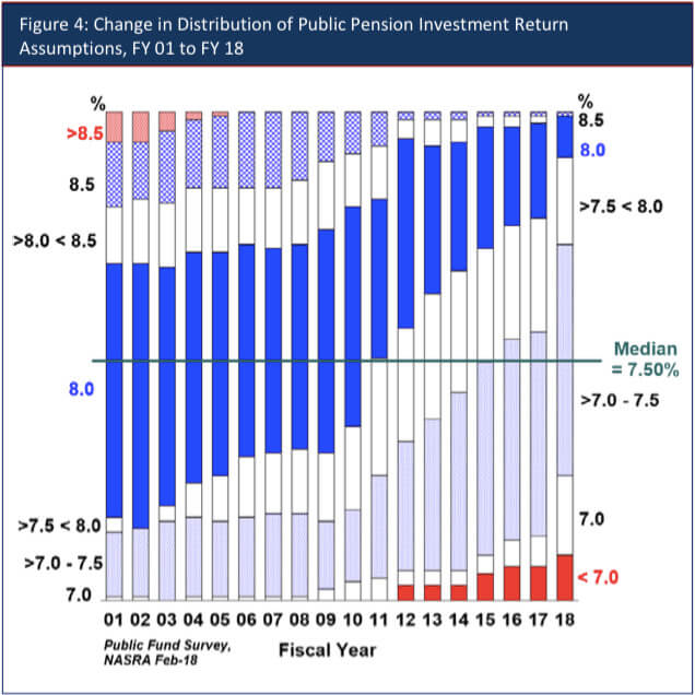 “Among the 129 plans measured, nearly three‐fourths have reduced their investment return assumption since fiscal year 2010, resulting in a decline in the average return assumption from 7.91 percent to 7.36 percent,” the report said. “If projected returns continue to decline, investment return assumptions are likely to also to continue their downward trend.”