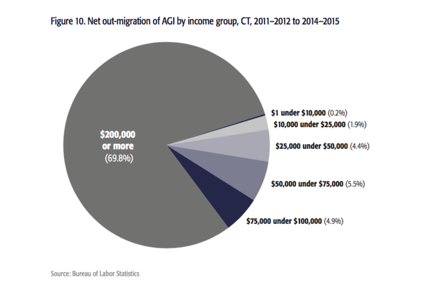 • Connecticut saw an outmigration of individuals making over $200,000 per year, which coincided with the 2011 and 2015 tax increases. High-income earners made up nearly 70 percent of the people leaving Connecticut during those times, according to the study.