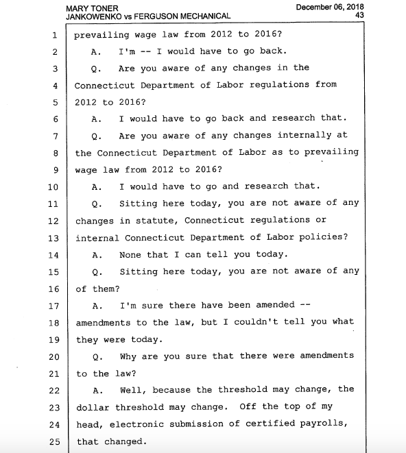 After finding Ferguson Mechanical Co. in violation of the state’s prevailing wage laws in 2016 under its new policy change, CT DOL essentially washed their hands of the matter.