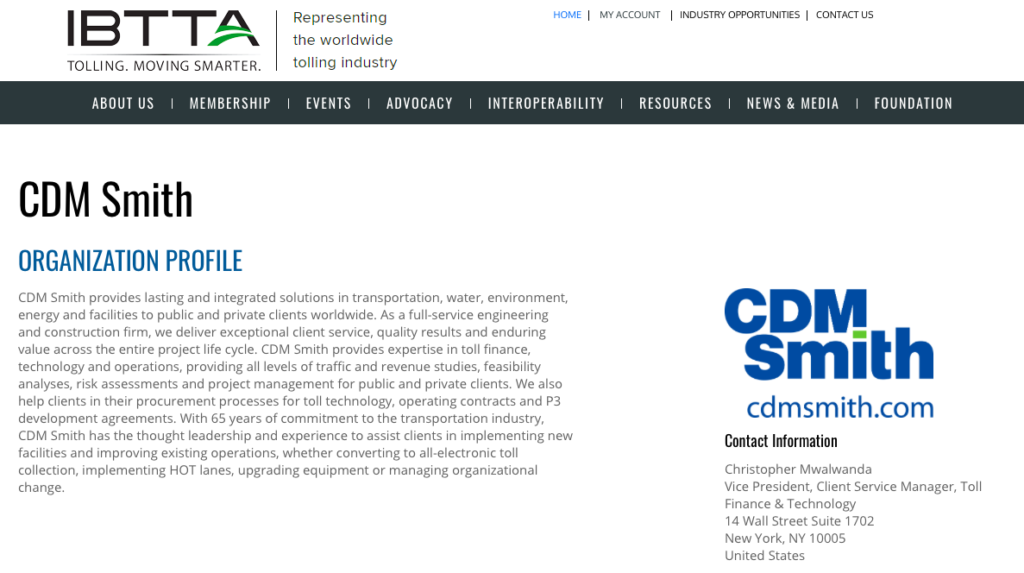 According to IBTTA Communications Director Bill Cramer, CDM Smith is a “sustaining member” of IBTTA, meaning CDM Smith brings in more than $5 million per year in toll-related income and pays $18,000 per year in dues to IBTTA.