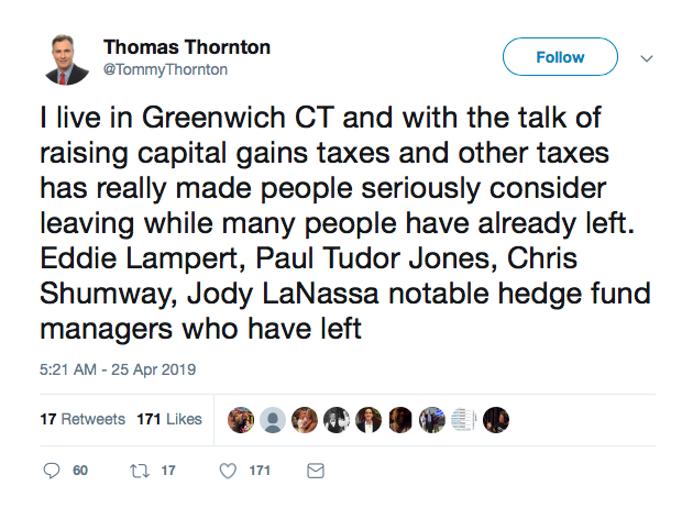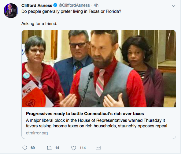 Asness’ tweet linked to a February article by CT Mirror in which the powerful Progressive Caucus in the House of Representatives called for increasing the income tax for Connecticut’s top income bracket.
