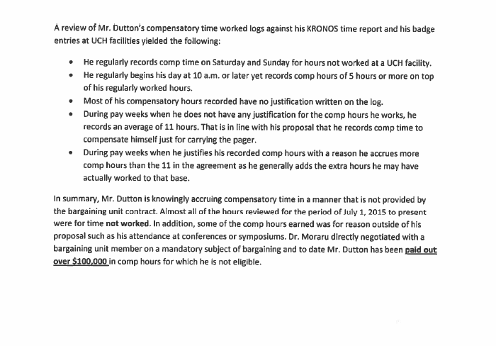 “In summary, Mr. Dutton is knowingly accruing compensatory time in a manner that is not provided by the bargaining unit contract. Almost all of the hours reviewed for the period of July 1, 2015 to present were for time not worked. In addition, some of the comp hours earned was for reason outside of his proposal such as his attendance at conferences or symposiums. Dr. Moraru directly negotiated with a bargaining unit member on a mandatory subject of bargaining and to date Mr. Dutton has been paid out over $100,000 in comp hours for which he is not eligible,” the investigation concluded.