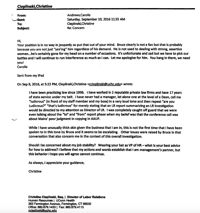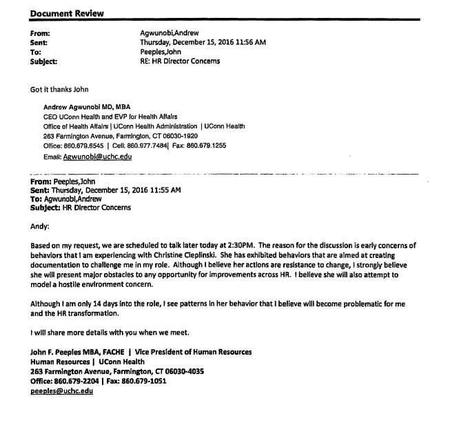 Peeples quickly emailed UConn Health CEO Andrew Agwunobi to indicate he believed Cieplinski sought to undermine his new role and that she would attempt to “model a hostile environment concern.”