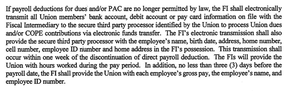 According to the contract, “If payroll deductions for dues and/or PAC (Political Action Committee) are no longer permitted by law, the FI (Fiscal Intermediary) shall electronically transmit all Union members’ bank account, debit account or pay card information on file with the Fiscal Intermediary to the secure third party processor identified by the Union to process the Union dues and/or COPE contributions via electronic transfer funds.”