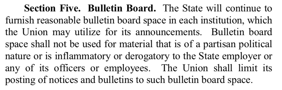 But according to A&R’s contract with the state, the bulletin board “shall not be used for material that is of a partisan political nature or is inflammatory or derogatory to the State employer or any of its officers or employees.”