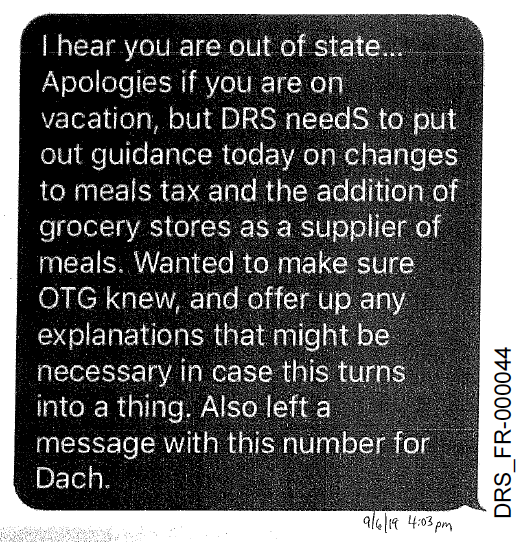 In a September 6 text message between Jackson and Lamont’s senior advisor, Jonathan Harris, Jackson wrote, “DRS needs to put out guidance today on changes to the meals tax and the addition of grocery stores as a supplier of meals. Wanted to make sure OTG (Office of the Governor) knew and offer up any explanations that might be necessary in case this turns into a thing. Also left a message with this number for Dach.”