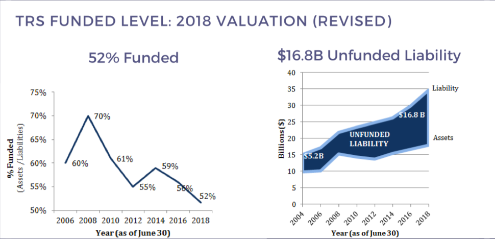 Since 2008, teacher pension funding has declined from 70 percent to 52 percent in 2018 and payments have risen from roughly $500 million to $1.2 billion.