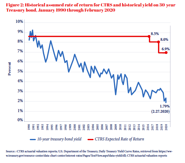 The 8 percent discount rate made sense in the early 1990s, when it matched a 10-year treasury bond yield. However, since that time the treasury bond yield has fallen, while Connecticut’s assumptions remained largely the same.
