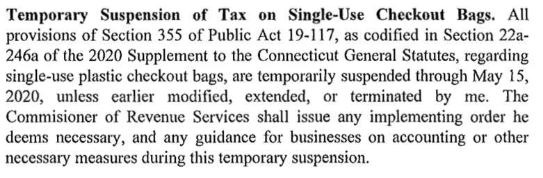 According to a press release from the Department of Revenue Services regarding suspension of the tax, the Lamont administration was responding to the “concerns of our retail employees who are enabling continued operation of critical services,” and encouraged shoppers using reusable bags to bag their own groceries.