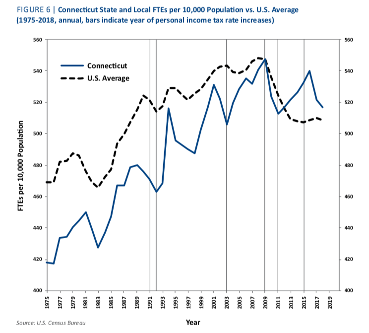 The study also notes that since the implementation of the income tax in 1992, Connecticut’s full-time state and local workforce has increased compared to the national average, and Connecticut’s public employees have the fifth-highest salaries in the country, as of 2018.