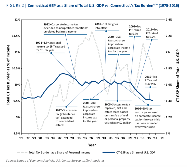 “With one of the highest overall tax burdens in the nation, Connecticut cannot afford to continually raise taxes without addressing spending,” the authors wrote. “As of this writing, Connecticut’s FY 2020 budget is the largest tax increase of any state.”