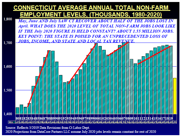 According to data compiled by Donald Klepper-Smith, chief economist for DataCore Partners, LLC and former economic advisor to Gov. M. Jodi Rell, Connecticut’s average annual job loss for 2020 so far stands at roughly 8 percent.