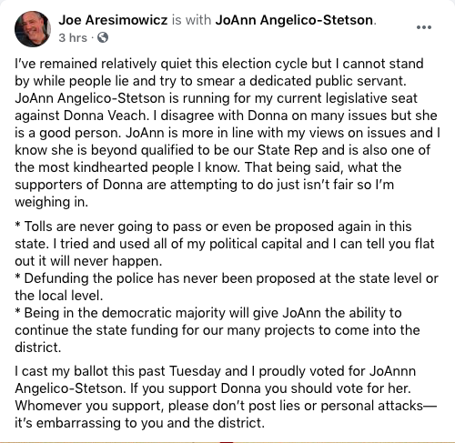 The post was Aresimowicz’s endorsement for JoAnn Angelico-Stetson, a Berlin Democrat running for the House of Representatives against Republican Donna Veach.