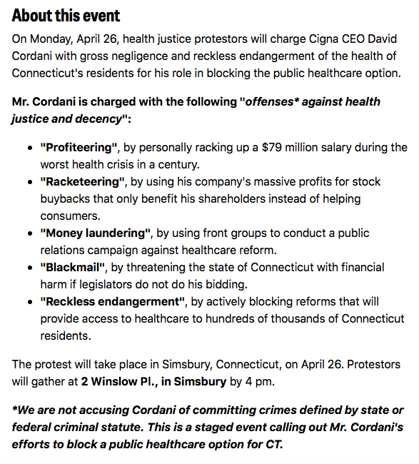 The protest invitation labels Cordani as a “healthcare bandit” and protesters will “charge” him with “gross negligence” and reckless endangerment” of the health of Connecticut’s residents for opposing the public healthcare option.
