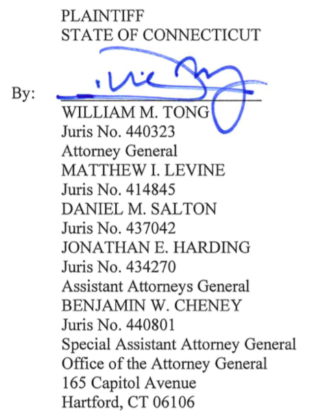During his two years as an SAAG, Cheney worked on Connecticut’s ambitious lawsuit against ExxonMobil, which was filed by Attorney General Tong in September of 2020. Cheney is listed as a special assistant attorney general in the court complaint filed on September 14, 2020. While the lawsuit against Exxon was transferred to federal court, documents indicate that Cheney continues to work on the case but now as an assistant attorney general.