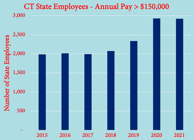 The number of Connecticut state government employees making more than Governor Ned Lamont’s $150,000 salary last year surged to 2,927, state pay records show.