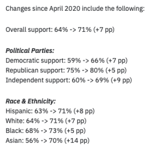 The data also reveals 66% of Democrats support choice (up from 59% in 2020), as well as 71% of Hispanic, 73% Black, 71% White and 70% of Asian voters when asked if they “support or oppose the concept of school choice?”