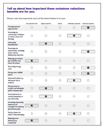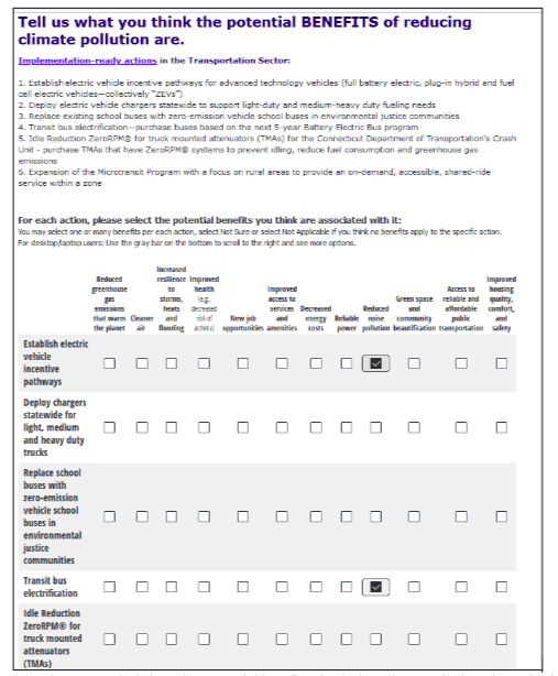I began filling out the survey, which laid out what the 14 benefits could achieve. When asked to “tell us about how important these emissions reductions are to you” I prioritized “affording a reliable vehicle,” and “access to a good paying job” which to me are both more important than a “lack of trees that provide shade,” among other options. Of all of the “benefits,” I am most skeptical of the potential for this program to “reduce greenhouse gas emissions to warm the planet,” since Connecticut contributes a pittance to global emissions.