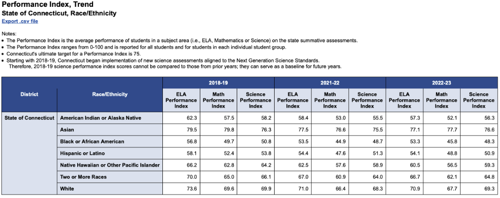 CTDOE reports that students across the state, regardless of race, did not reach the levels of proficiency in math, English language arts and science seen before the pandemic (2018-19). An outlier to the trend is the performance of Asian students who have shown a slight improvement in science.