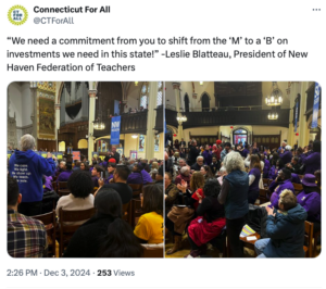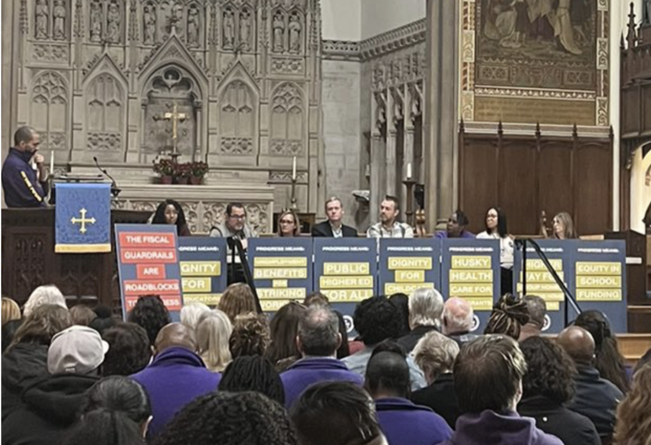 Connecticut For All, a coalition of unions and special interest groups, hosted a town hall discussion on Tuesday (Dec. 3), at Christ Church Cathedral in Hartford, demanding legislative action to overhaul the state’s fiscal guardrails and clear the way for billions in new spending.