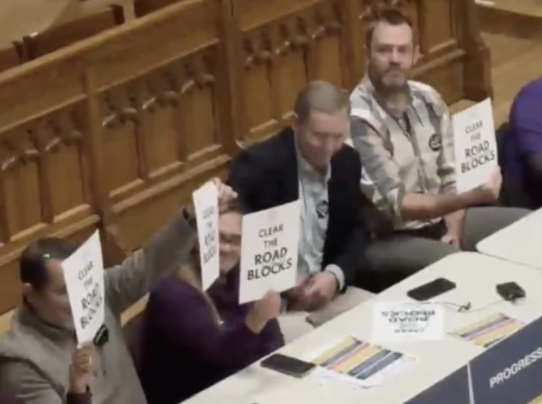 The meeting wrapped up with everyone on the panel, including Rep. Elliott and the audience, but not Speaker Ritter, enthusiastically holding up signs reading “Clear the Road Blocks. Speaker Ritter’s reluctance to join in could be a hopeful sign that he’s not fully on board with dismantling the fiscal guardrails to grant unions their wish for billions in extra spending.