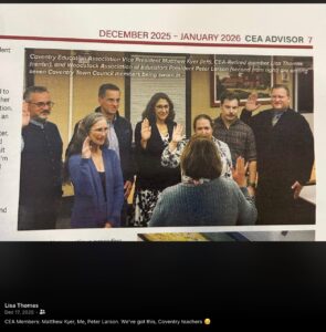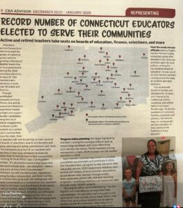 In its latest Advisor newsletter, the CEA announces a “record number of Connecticut educators elected to serve their communities,” complete with a statewide map dotted in red pins marking each victory. Active and retired teachers, the union reports, now sit on boards of education, finance boards, selectmen’s offices, and town councils across Connecticut.