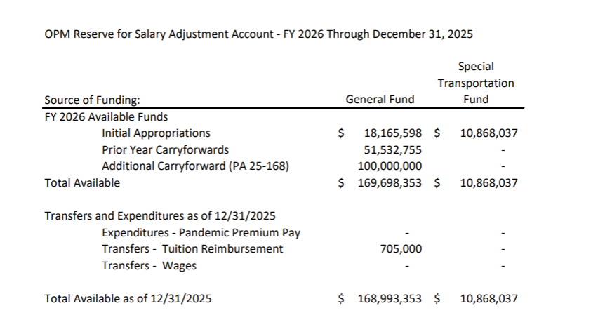 Start with the Reserve for Salary Adjustment (RSA) account — a fund administered by the Office of Policy and Management that exists specifically to cover collective bargaining costs, wage settlements, accrual payouts, and other negotiated compensation items.